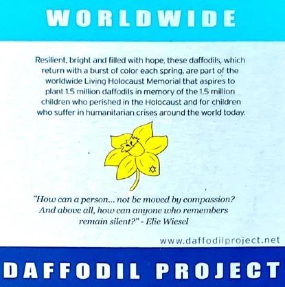“Resilient, bright and filled with hope, these daffodils, which return with a burst of color each spring, are a part of the Worldwide Living Holocaust Memorial that aspires to plant 1.5 million daffodils in memory of the 1.5 million children who perished in the holocaust and for the children in humanitarian crises around the world today.”